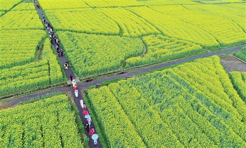 圖為游客在湖南省衡陽縣庫宗橋鎮油菜花海里游玩。 曹正平攝 (新華社發)