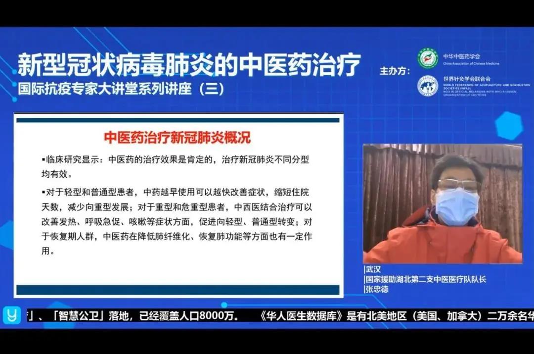 國家中醫(yī)藥管理局應(yīng)對新冠肺炎疫情防控專家組副組長、廣東省中醫(yī)院副院長張忠德,以“新型冠狀病毒肺炎的中醫(yī)藥治療”為題,介紹了中醫(yī)藥治療概況、中醫(yī)藥治療效果、第七版診療方案的中醫(yī)部分和針灸診療方案內(nèi)容、治療體會等。在答疑環(huán)節(jié),張忠德解答了9個醫(yī)生關(guān)切的問題。
