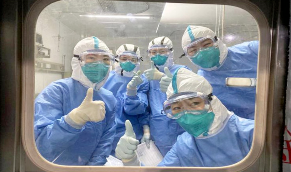 國家中醫(yī)醫(yī)療隊隊員為戰(zhàn)“疫”加油。
