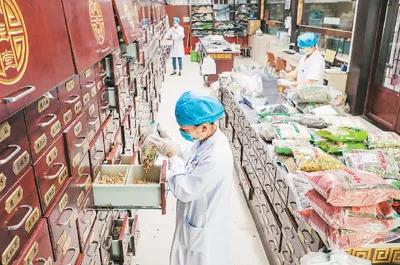 山東省滕州市中醫醫院中藥師將中藥材裝斗。宋海存攝(人民視覺)