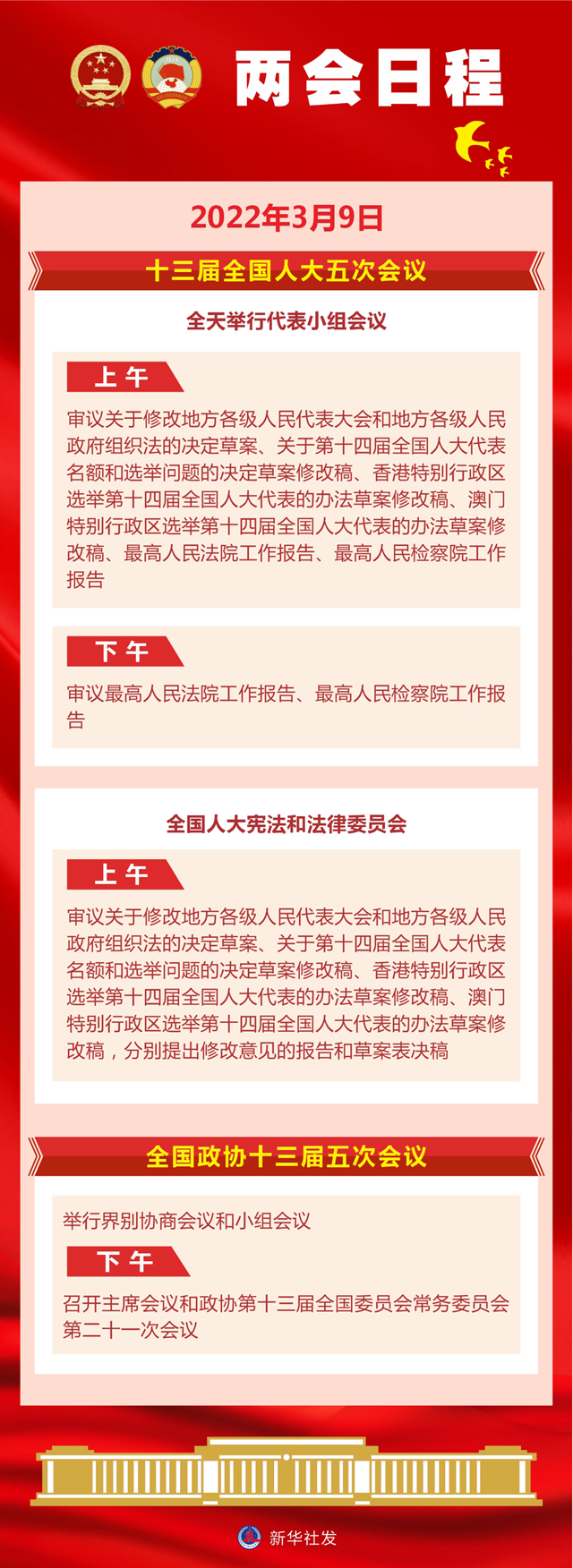 新華社北京3月8日電 十三屆全國人大五次會議9日全天舉行代表小組會議。上午,審議關于修改地方各級人民代表大會和地方各級人民政府組織法的決定草案、關于第十四屆全國人大代表名額和選舉問題的決定草案修改稿、香港特別行政區選舉第十四屆全國人大代表的辦法草案修改稿、澳門特別行政區選舉第十四屆全國人大代表的辦法草案修改稿、最高人民法院工作報告、最高人民檢察院工作報告;下午,審議最高人民法院工作報告、最高人民檢察院工作報告。